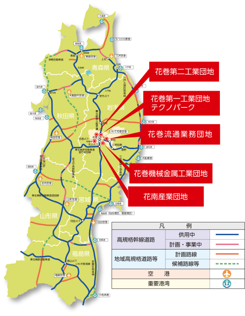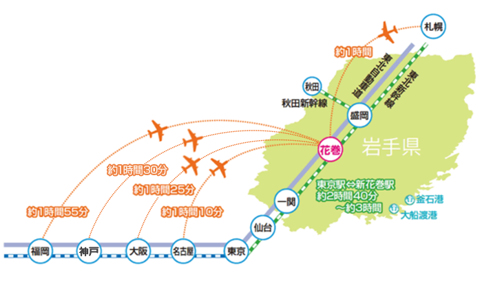 岩手県のほぼ中央にある花巻市は、肥沃な北上平野に位置し、季節ごとの自然が美しいまちです。岩手県唯一の空の玄関口「いわて花巻空港」を抱え、札幌、大阪、名古屋、福岡に加え、2018年には台湾、2019年1月から中国・上海との定期便も就航。東北新幹線・東北縦貫自動車道が市を南北に貫き、東西の自動車道とクロスするなど高速交通網の結束点です。
