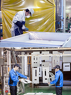 作業は、材料の切断、曲げ、溶接から始まり、傷や錆から守るために塗装を施し、組み立てへと移ります。その後、機器取り付け、配線となりますが、この作業に時間を要します。
