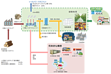 株式会社花巻バイオマスエナジーは、木材(チップ)を燃料とした木質バイオマス発電事業の会社として平成26年10月に設立。花巻バイオチップ株式会社は、間伐材等の木材を発電燃料となるチップに加工し供給する会社として平成27年2月に設立しました。